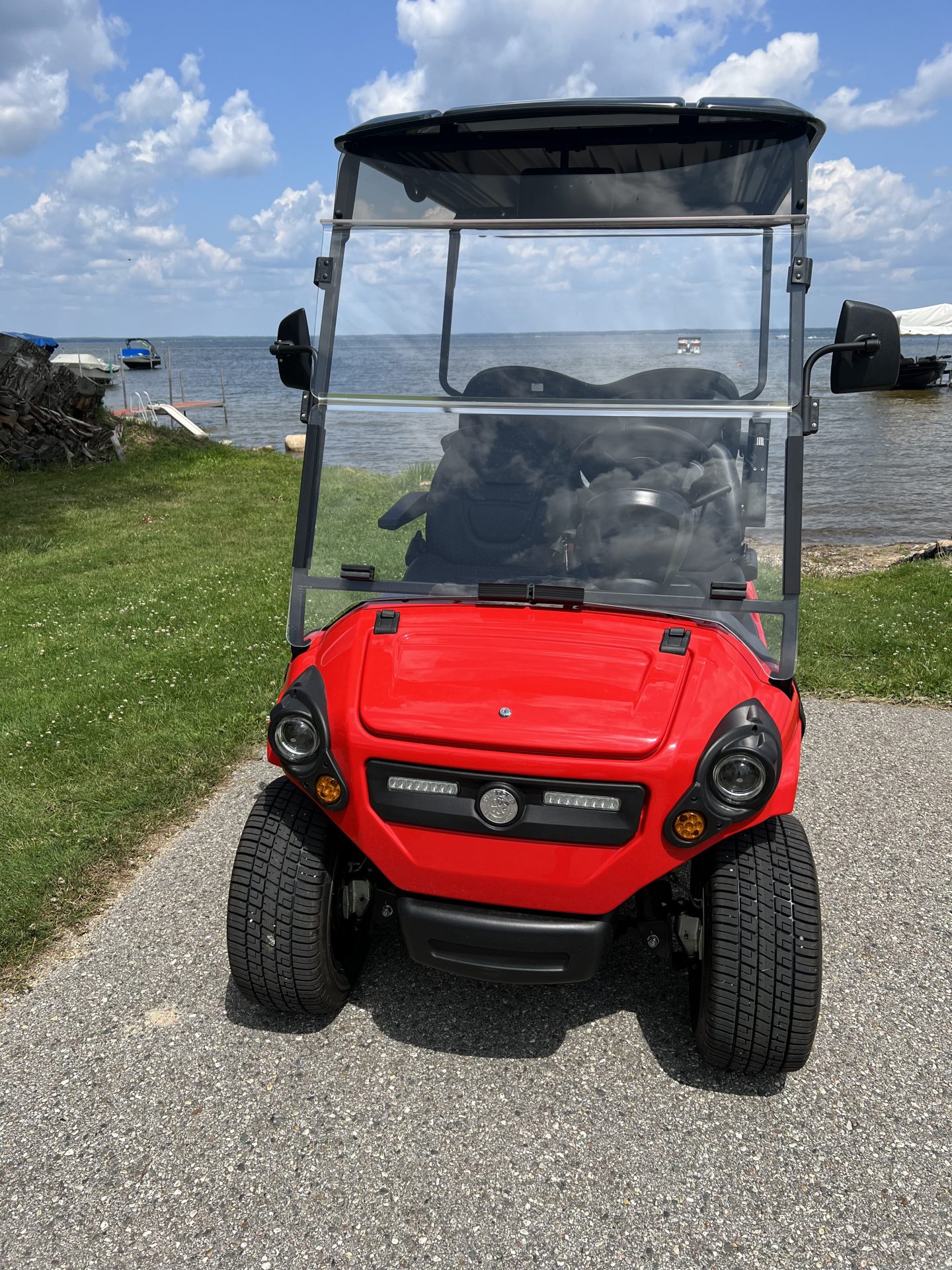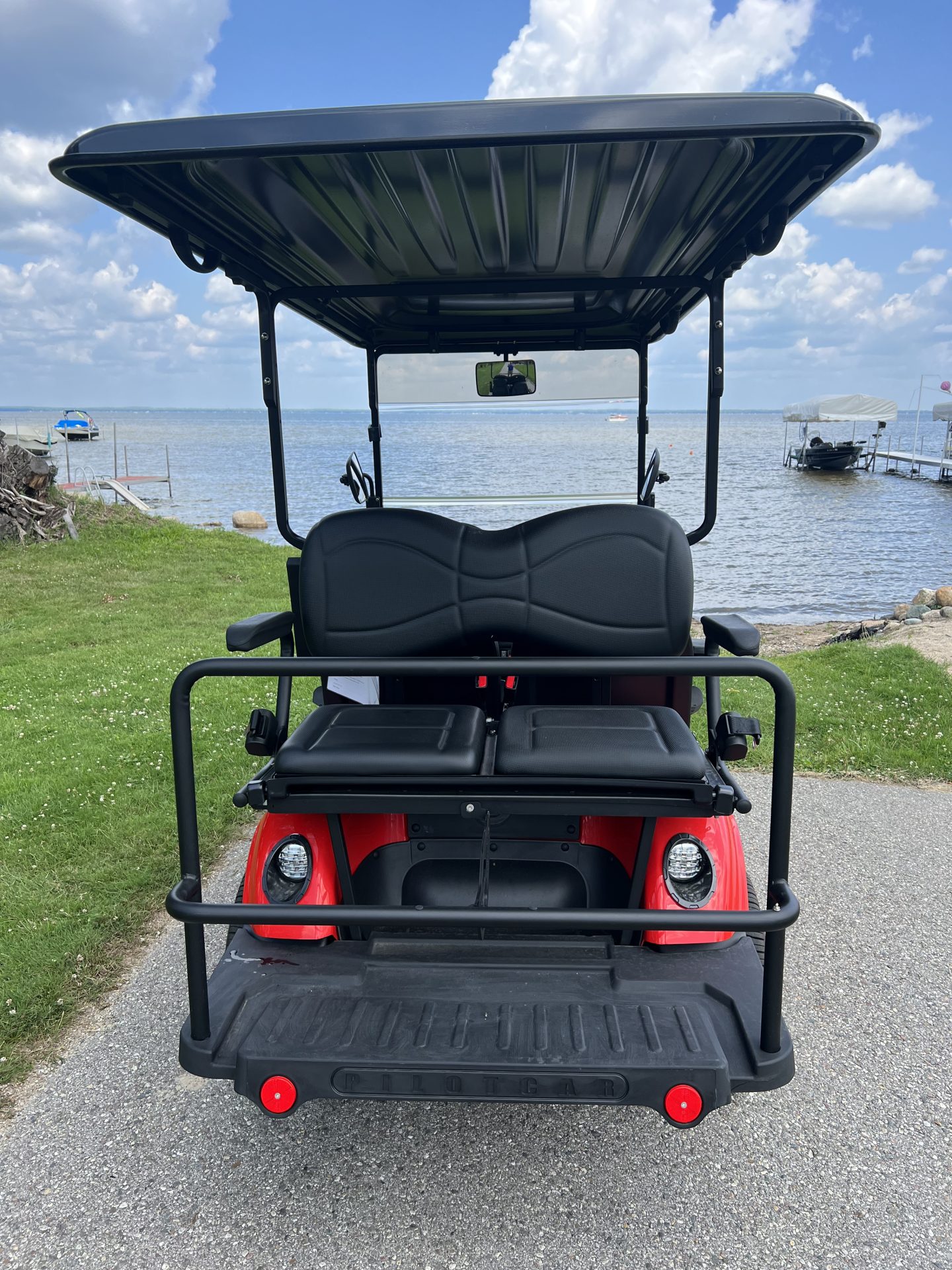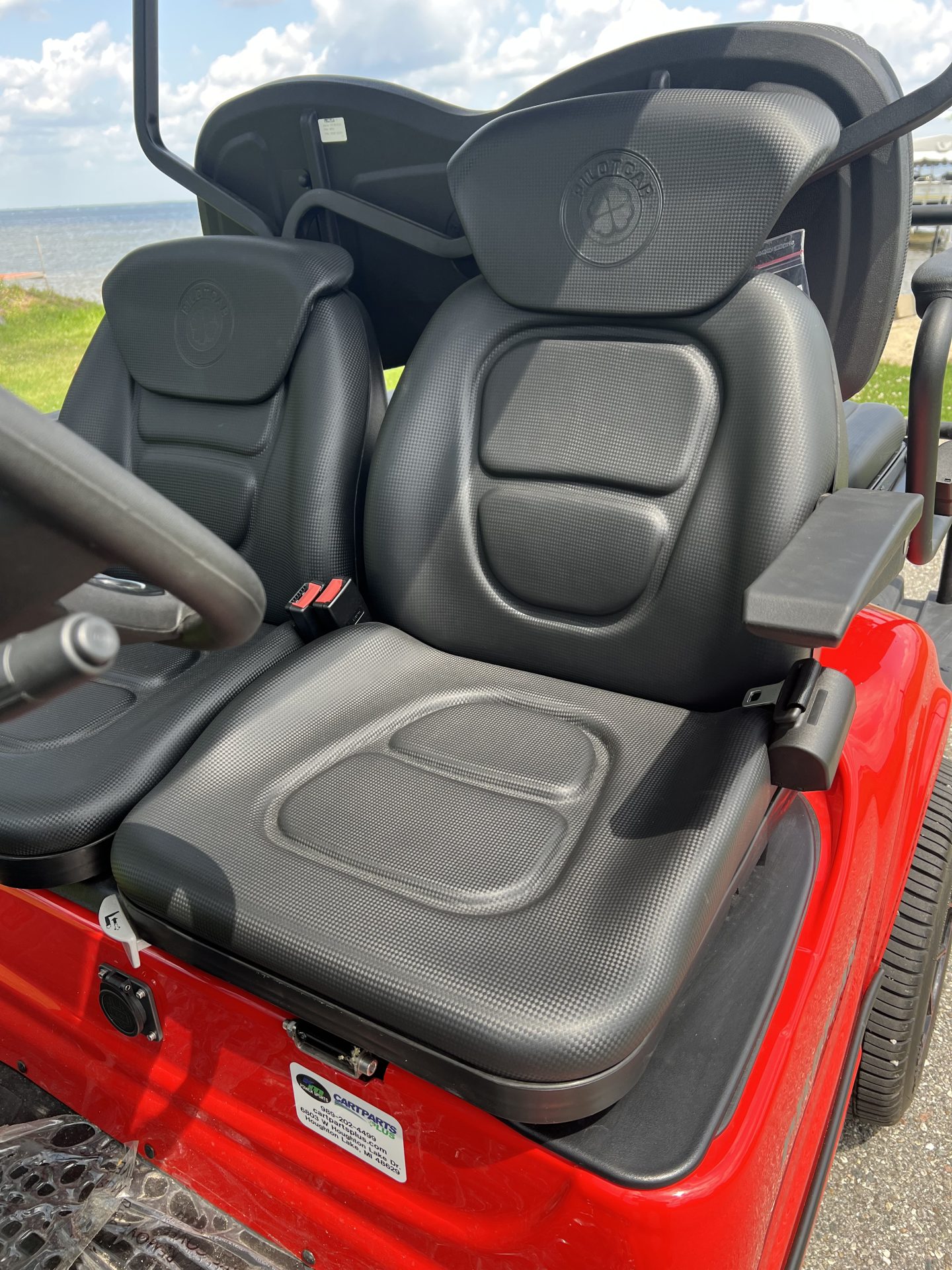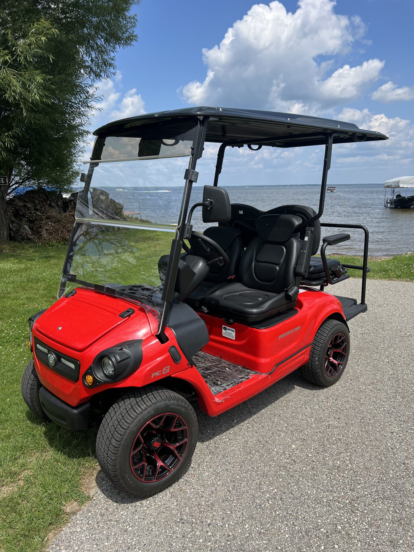This is a new 2022 Pilot Car PC2+2 (4 seater) golf cart. These cars are top of the line German/Turkish engineered carts and made in Turkey (not China) with independent suspension and 4 wheel hydraulic brakes. This cart includes the upgraded red body with a locking front trunk. Cart includes retractable seatbelts, digital display, turn signals, horn, adjustable bucket seats, USB charging ports, folding rear seat kit, rear safety bar, built in charging system, lithium battery pack, battery monitoring system, extended top, and side and rearview mirrors.