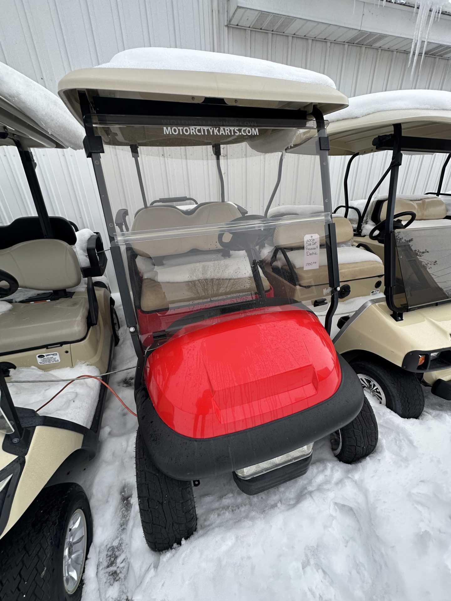 2006 Club Car Precedent 48V electric cart in cranberry red exterior color. Cart has a black roof as well. Folding windshield, LED headlight, folding rear seat