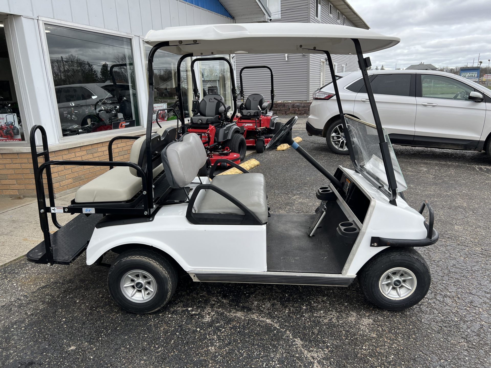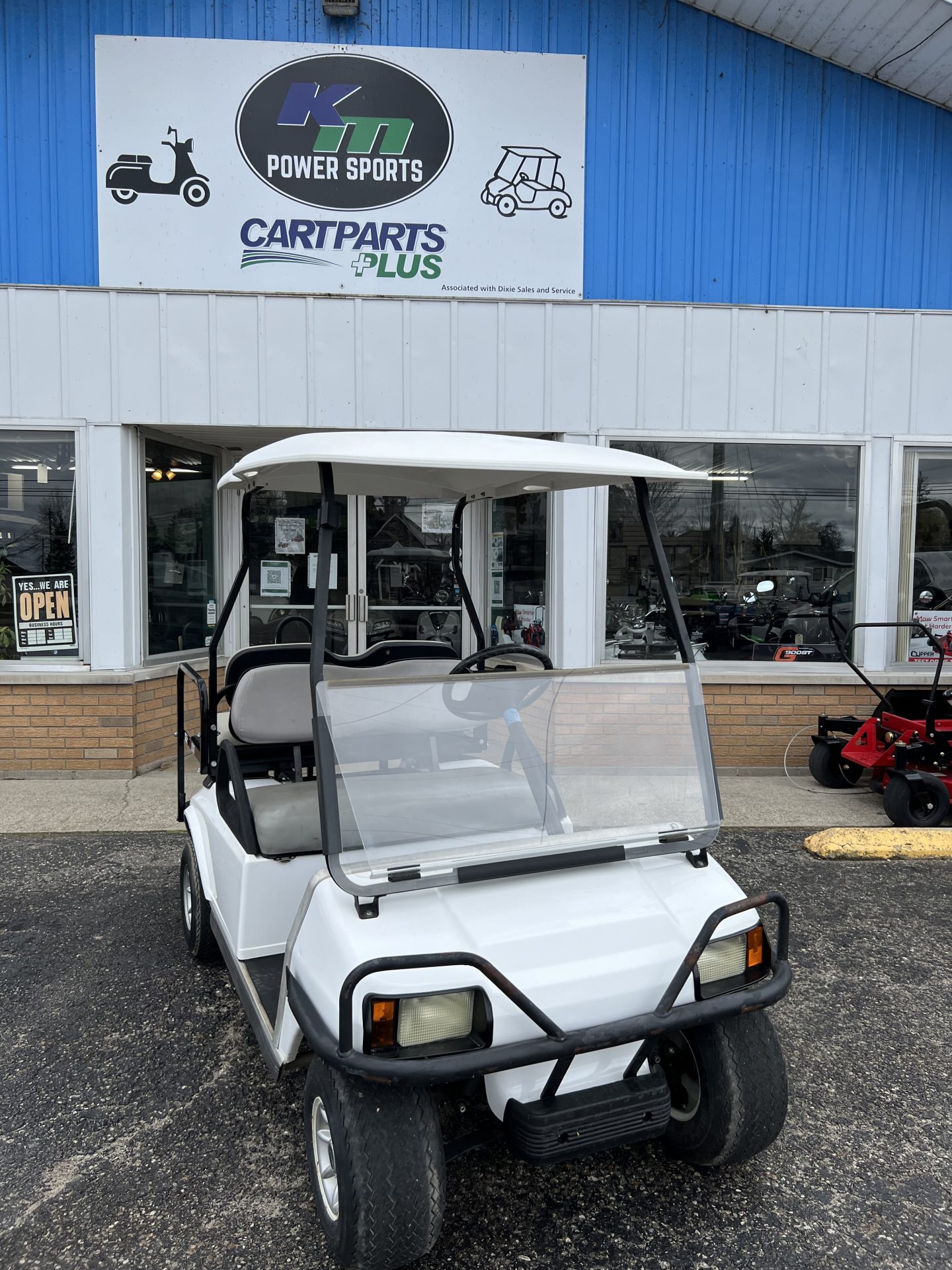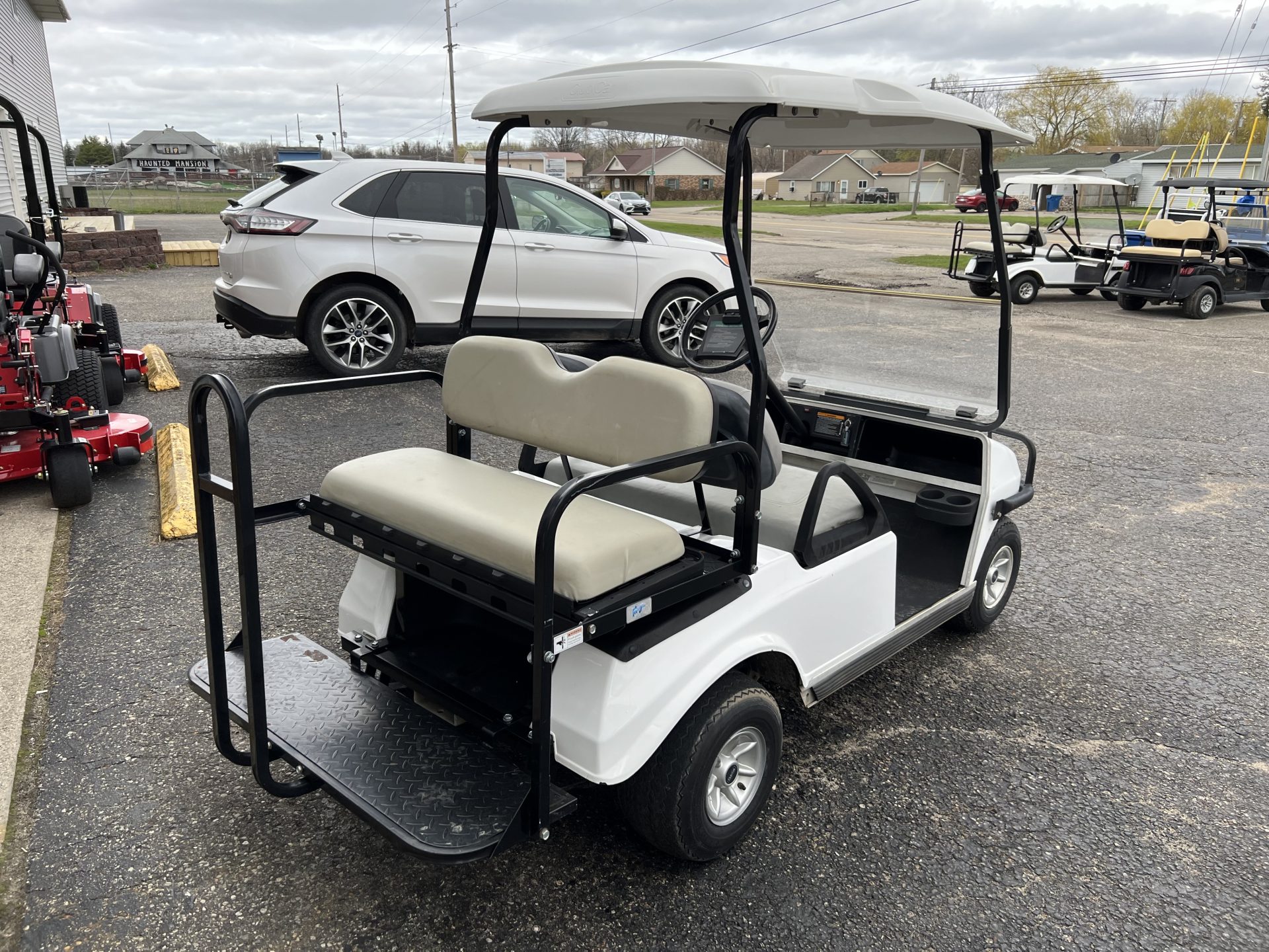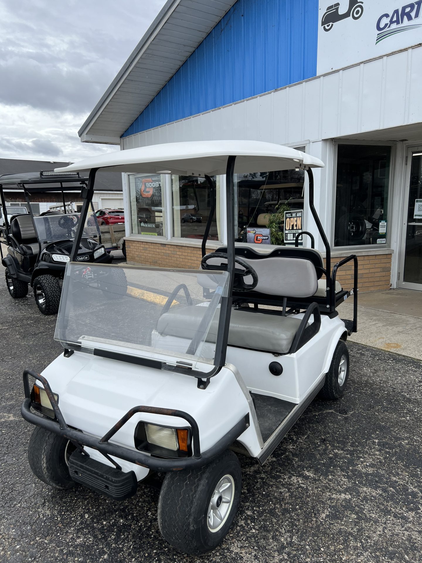 The tried and true Club Car DS all set up with rear seat kit and flip down feature.   Time for us to roll them out of rentals and sell them to make you an affordable golf cart– a gas cart 4 passenger under $5k, awesome!